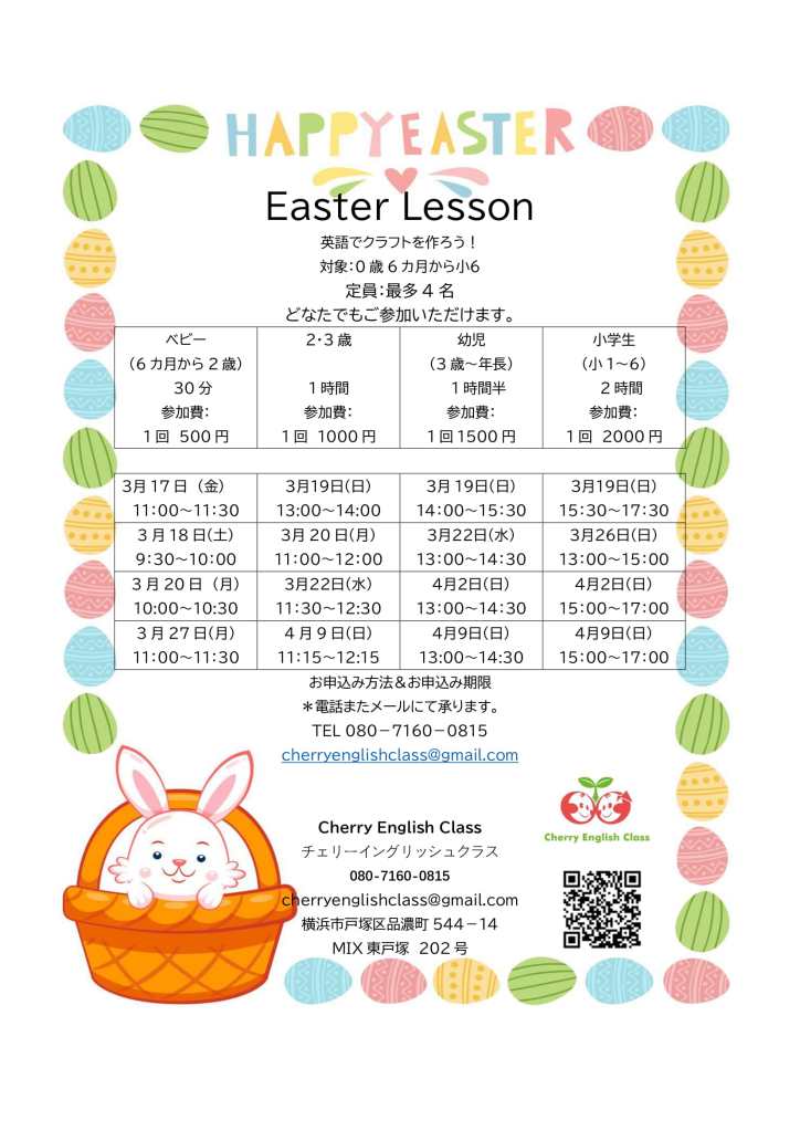 初めての方や場所見知り・人見知りのお子様は保護者の方が一緒でも大丈夫です。イースターの絵本やお歌はもちろん。クラフトでは、イースターエッグを発砲スチロールを使って作ります。英語が初めてのお子様でも大丈夫です。