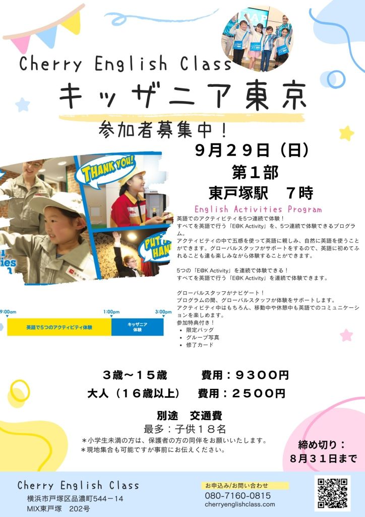9月29日、Cherry English Classではキッザニア東京へ行き、子どもたちが英語を使いながら様々なお仕事に挑戦しました!